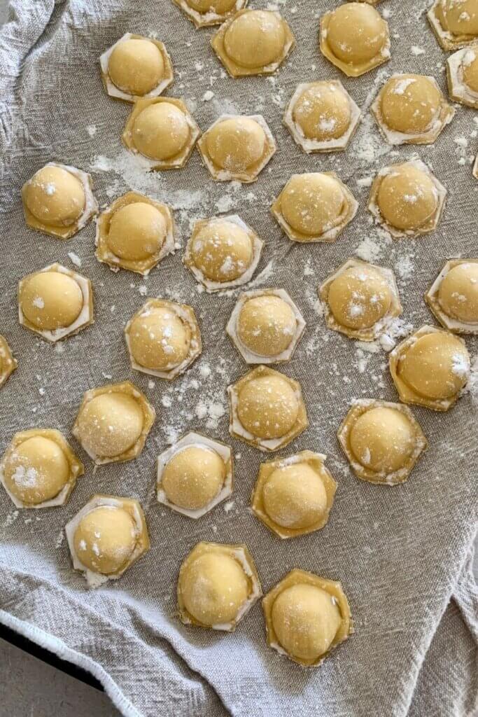 You will also be able to roll the pasta dough thin enough to make ravioli and tortellini. I use a Russian Pelmeni (little dumpling) cutter to make the cutest sourdough ravioli! You can find the Pelmeni cutter I use here.
