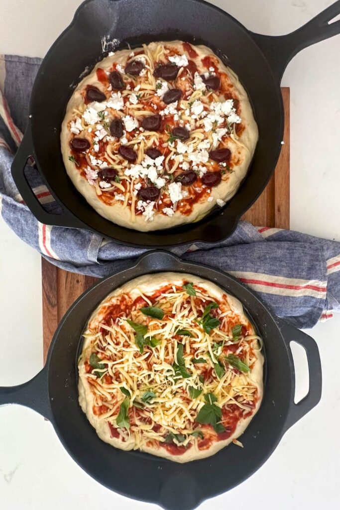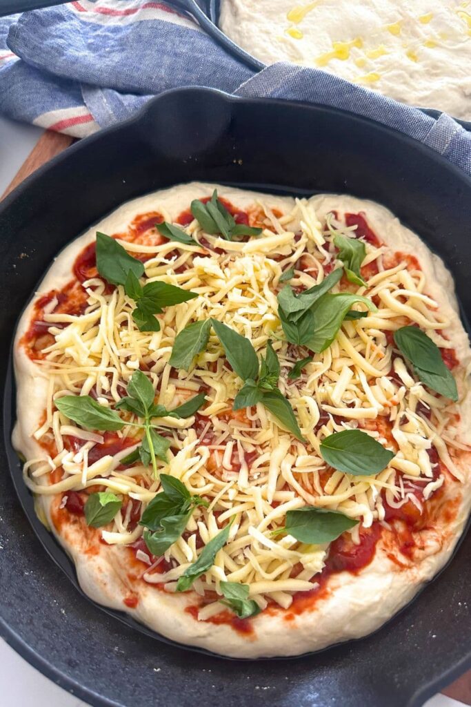 Baked in a cast iron skillet, this sourdough pizza focaccia bread gives you a crispy, golden base with a pillowy soft focaccia crumb, topped with tomato pizza sauce, mozzarella and everything you love on a pizza!
