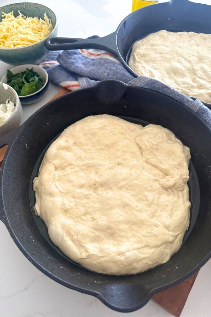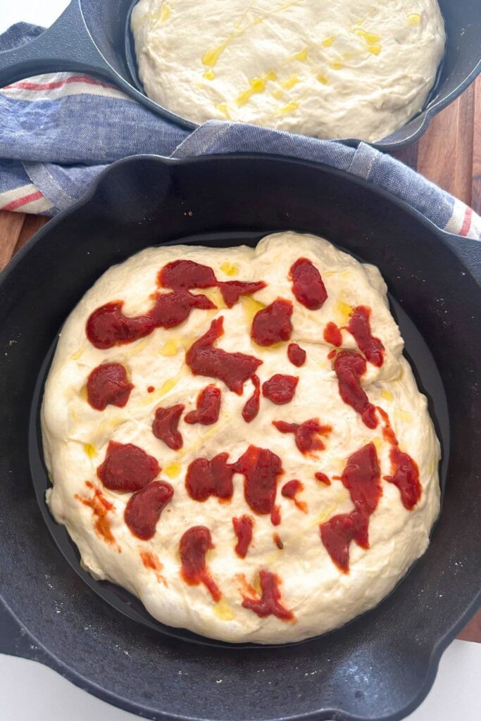 - Rub your hands with a little olive oil and gently pull the dough out to fill the skillets. Again it doesn't have to be perfect as it will naturally fill the skillets as they proof.