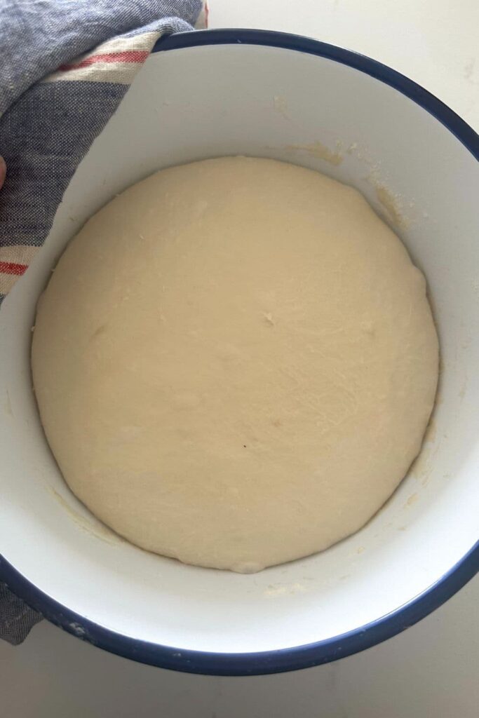 Now you want to leave your dough to ferment. Cover it with a tea towel or plastic wrap and leave it alone to double.