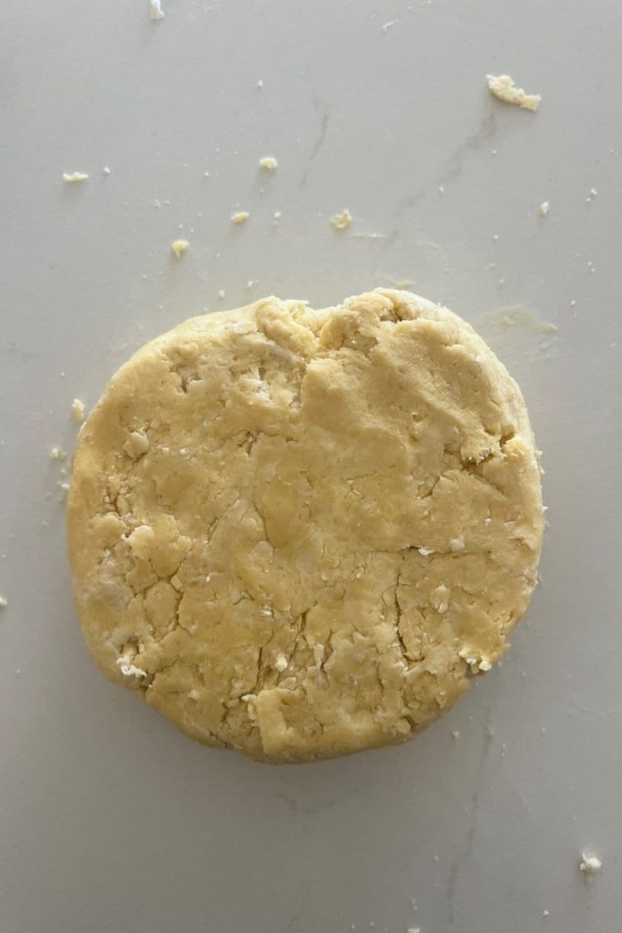 - Tip the rough dough out onto the counter, divide the dough into two pieces and bring each piece into a rough ball. Wrap each ball of pastry dough in parchment paper and squash it down into a disc shape. Wrap each disc in cling wrap and place both discs into the fridge.If you prefer to just refrigerate as one ball, that's fine too. You can just divide the pastry into two pieces when you want to roll it out.