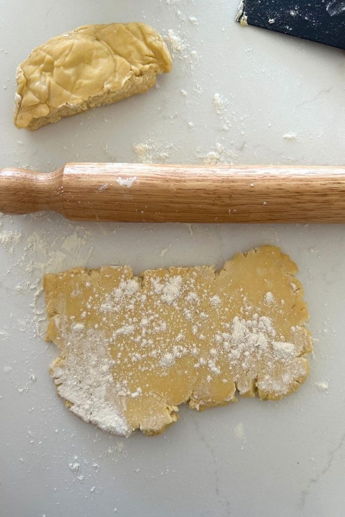 Using a rolling pin, roll out one disc of pastry until it's around 3mm or ⅛" thick. You want to create 12 rectangles from this dough (I've made my rectangles around 8cm x 12cm (3" x 5") - you can make your bigger or smaller if you prefer). To cut the rectangles, I used a ruler to measure them out (so they're all uniform) and a metal dough scraper to cut the dough. A pizza cutter is also a really handy tool to cut the pastry if you have one.