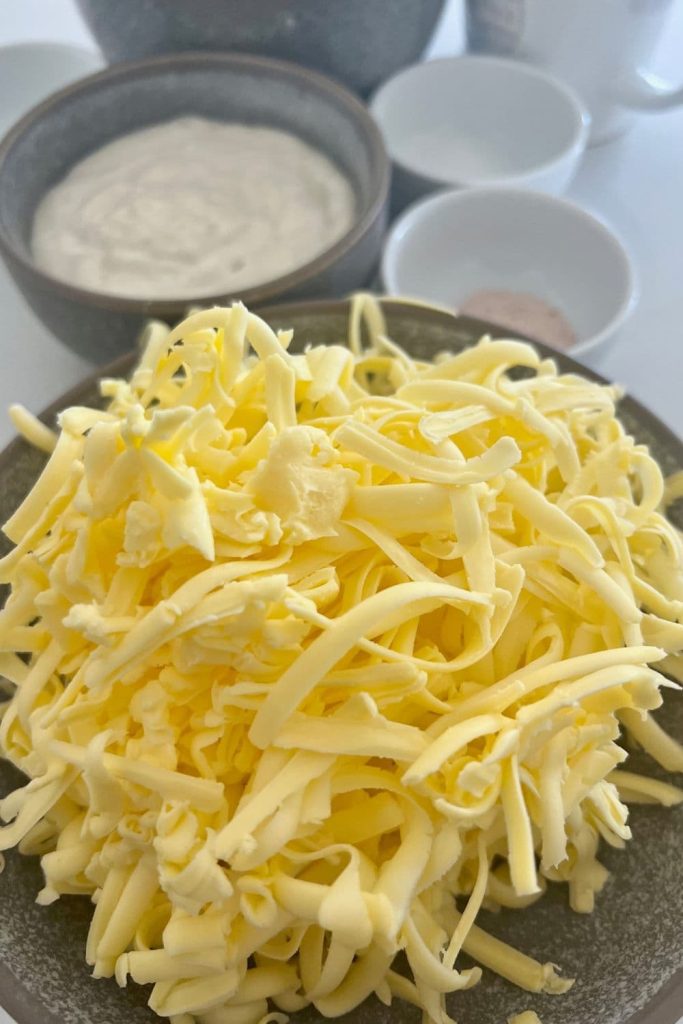 - Grate the cold butter into a bowl. If the butter starts to melt or is very soft once grated, place the bowl into the freezer. This will help to firm the butter up and make the next step much easier. I cannot stress enough how important it is for the butter to be COLD.