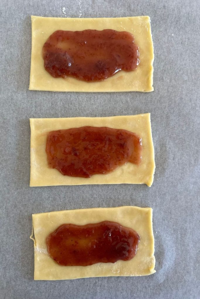 Add your filling, ensuring you keep it in the middle. You'll want around a tablespoon of filling for each pop tart. You don't want to overfill them as the filling will leak out.