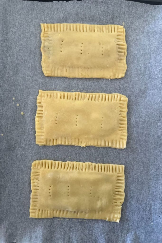 - Now use a fork to crimp the edges and seal the pastry edges. Pop a few holes in the top of each pop tart using your fork to ensure the topping doesn't burst out.