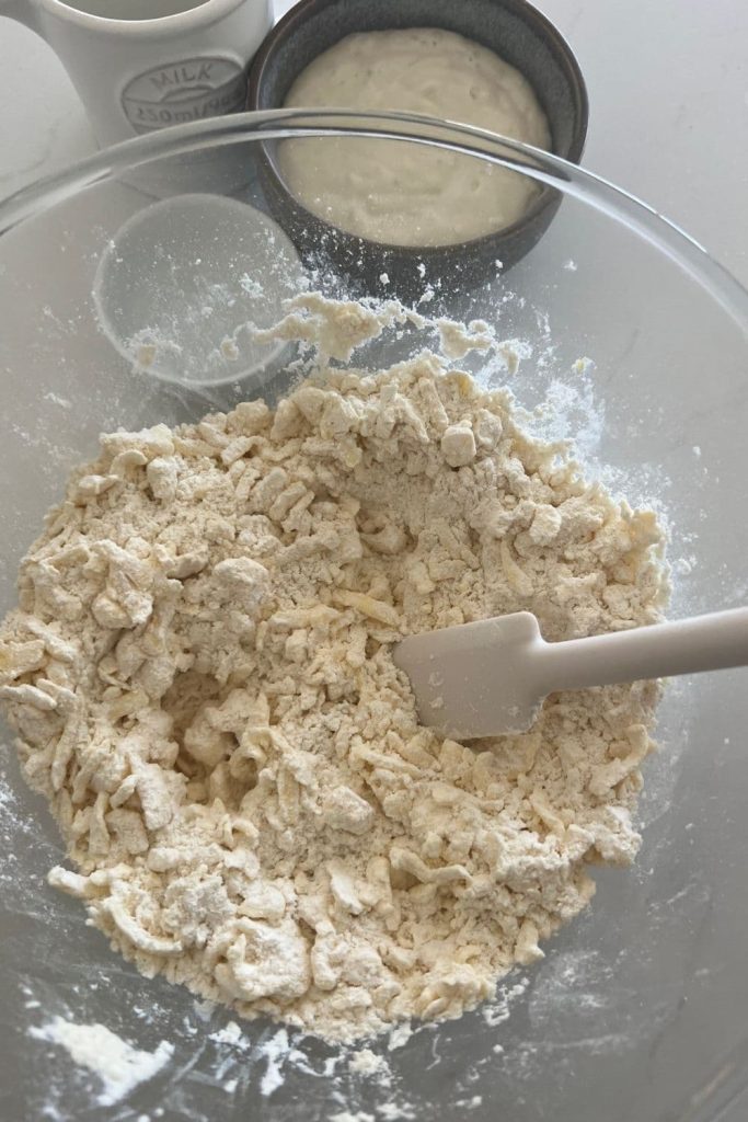 - Place the cold, grated butter into the bowl with the flour, salt and sugar and use a spatula, pastry cutter or simply your finger tips to coat the butter in the flour. You want the butter to stay cold, so try to touch it as little as you can.