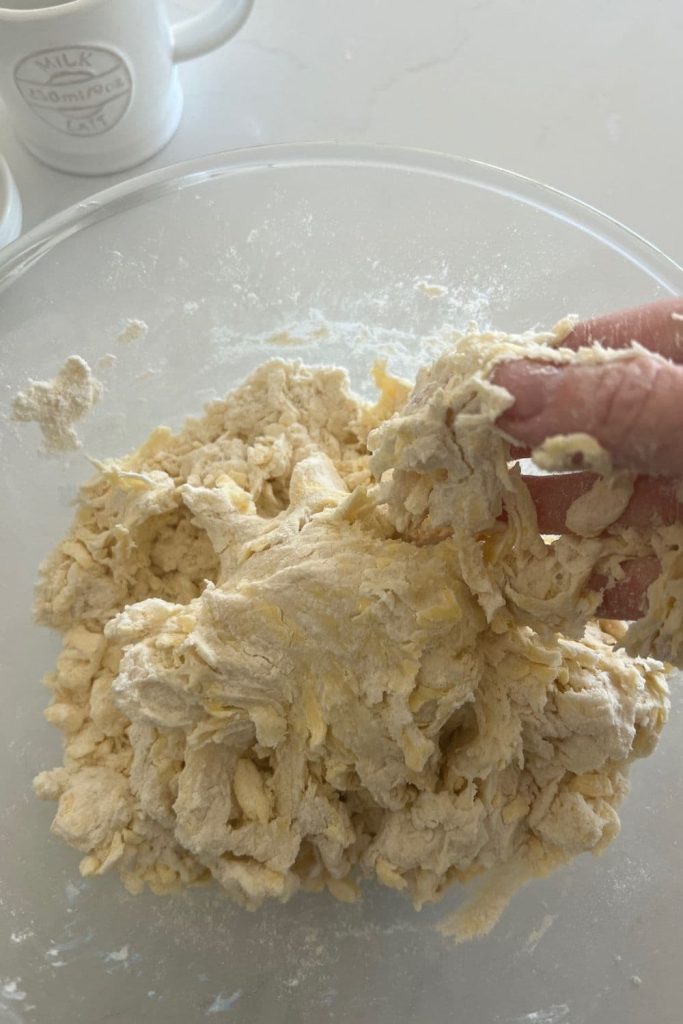 Now, add the sourdough starter or discard and vinegar and bring the mixture into a dry, shaggy dough. It's best just to use your hands to squeeze the pastry dough together. It will be a rough, dry dough.