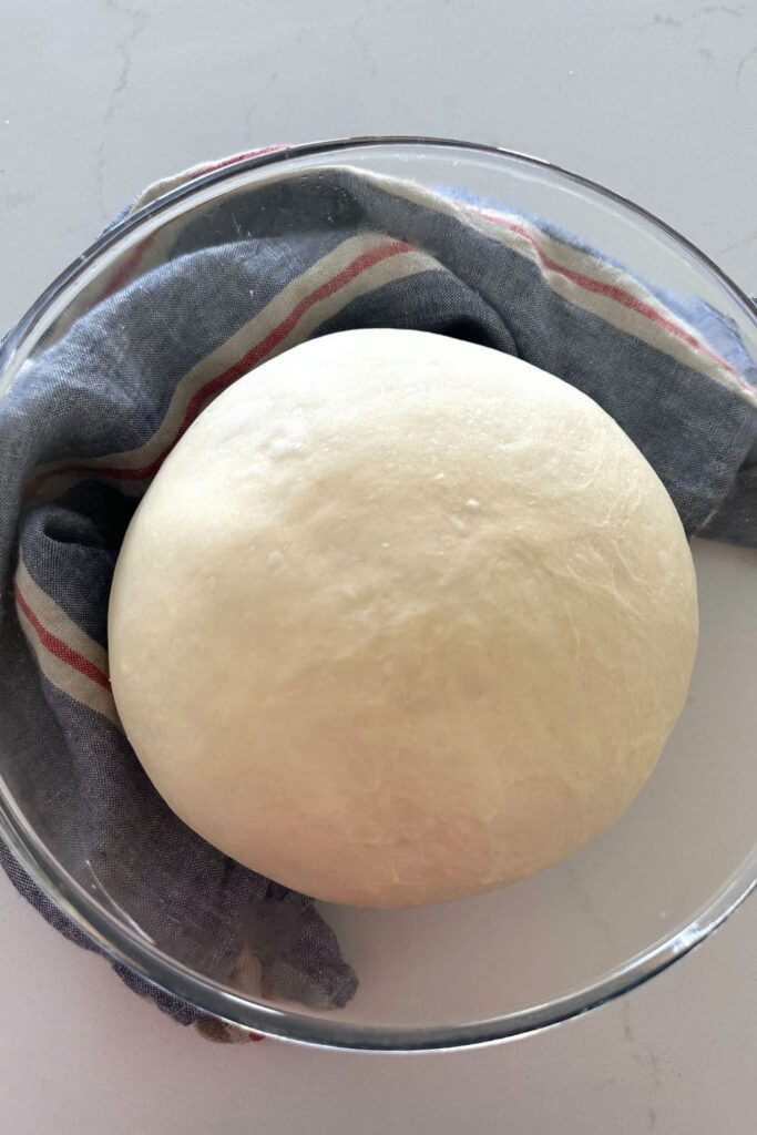 Once the dough is sufficiently kneaded, you'll need to allow it to rise, covered with plastic, at room temperature. You want the dough to rise around 50%.