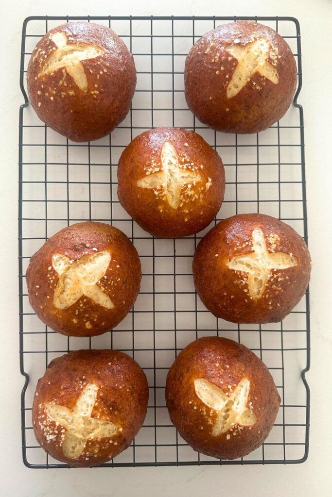 Bake the pretzel buns for around 15 to 20 minutes at 200C/390F. Remove them from the oven when they are golden brown.