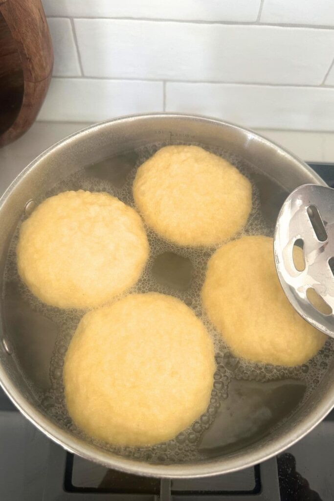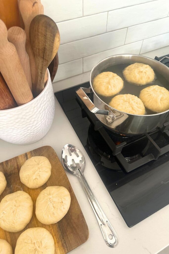 - When the water is boiling, carefully place 3 to 4 pretzel buns into the boiling water at a time. You want to boil them for around 30 seconds each. They should float to the surface and that's when you know to take them out.