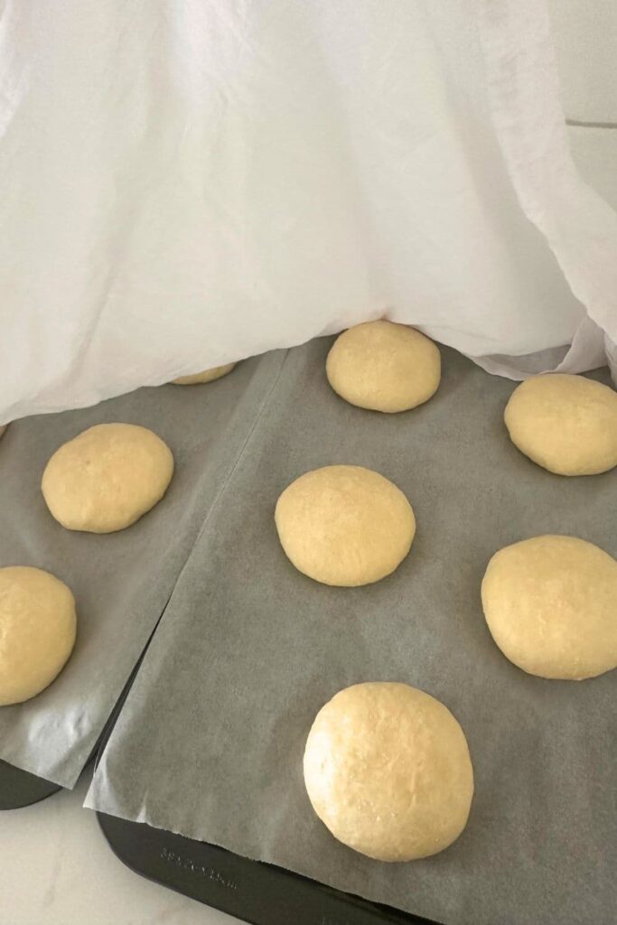 Cover the pretzel bun dough balls with a dish towel and allow them to become lovely and puffy.