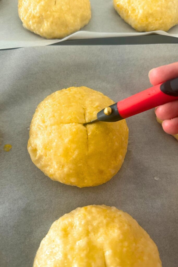 - Using a pastry brush, brush on the egg wash mixture and then sprinkle with salt or seeds as desired. Use a sharp knife or lame to cut a small cross into the top of each bun. It doesn't need to be deep, just enough for the bun to open up in the oven.