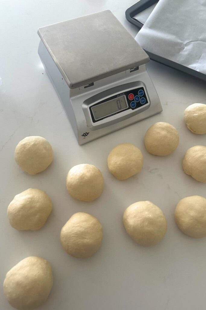 - Once the dough has risen, you'll need to shape the pretzel buns.Divide the pretzel dough into 11 equal portions. I've done 11 x 80g portions, but you can make them bigger or smaller to suit your needs.