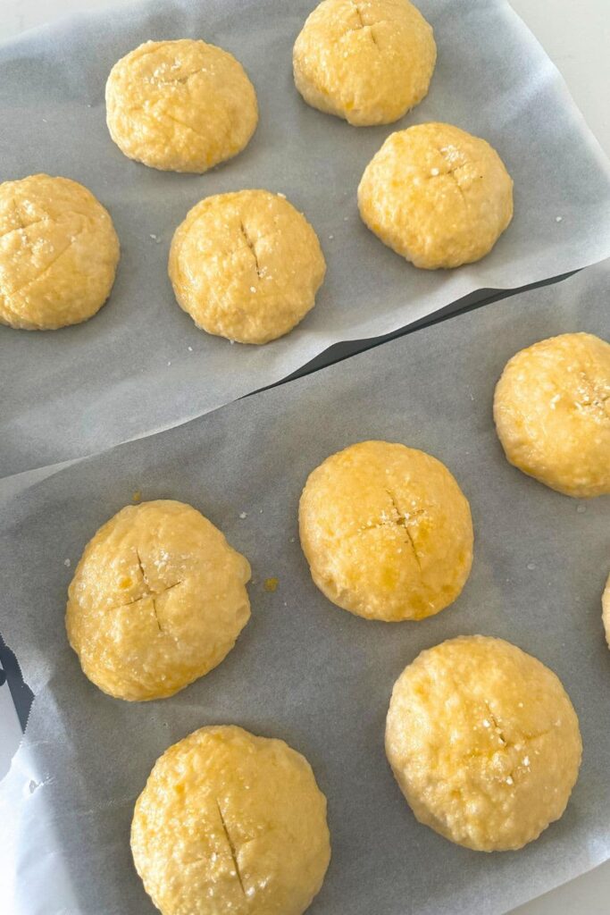 Lay the pretzel buns onto a baking tray lined with parchment paper.
