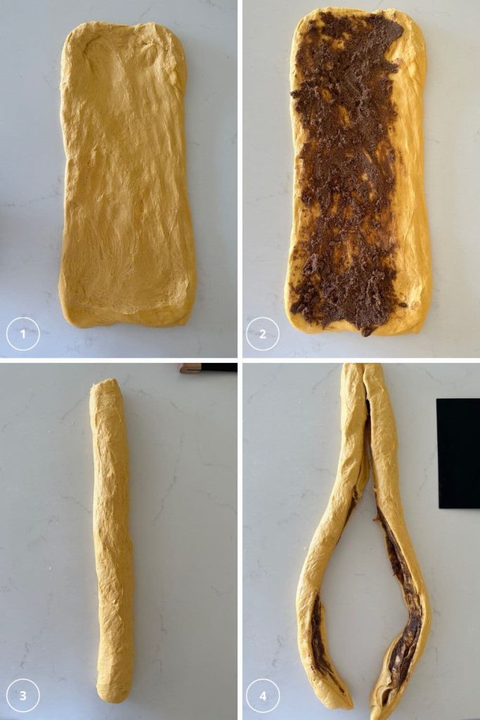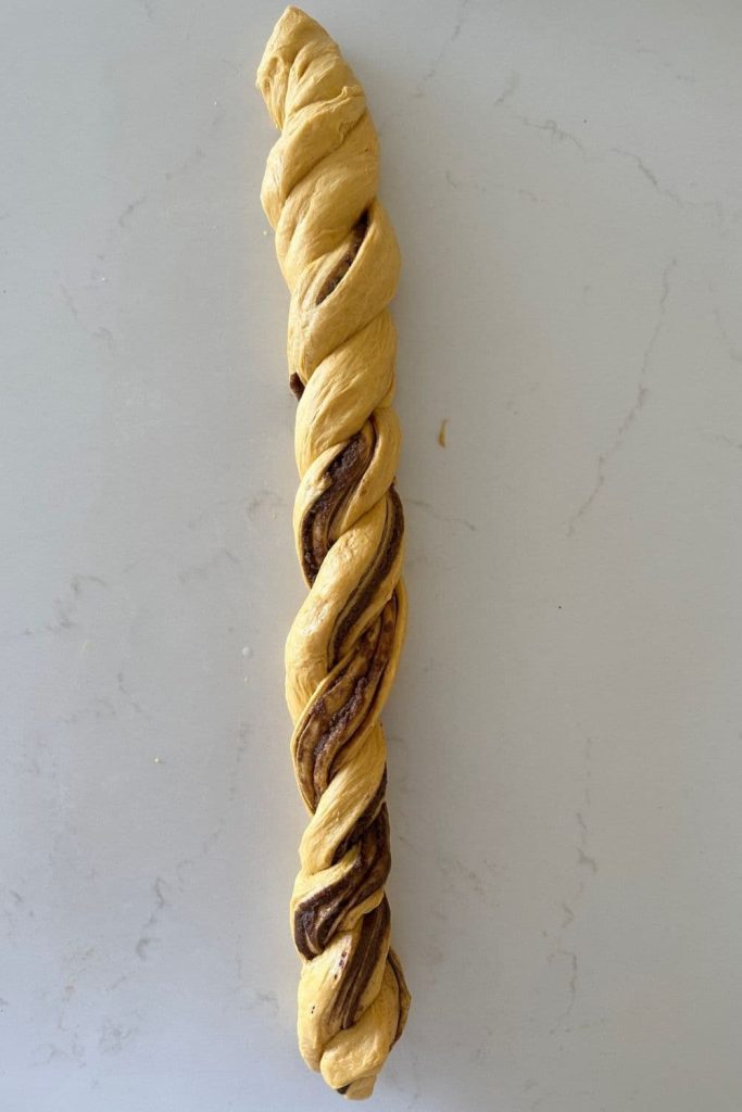 - Now twist the two lengths of dough into a rope, twisting it so that the filling is swirled around the dough.