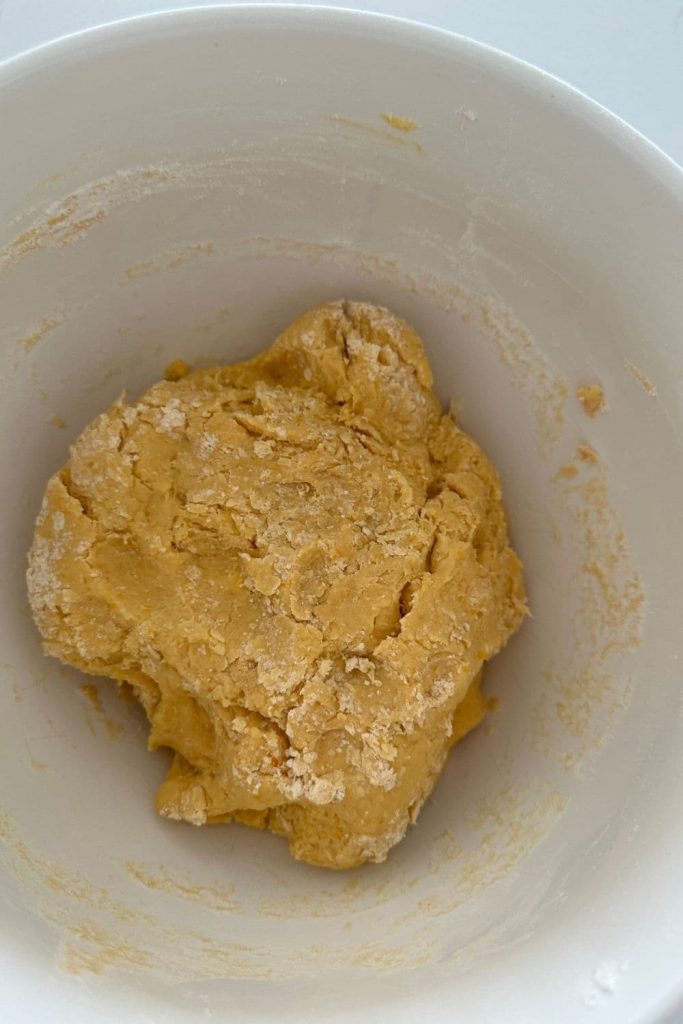 - On top of the pumpkin puree mixture, add the bread flour, melted butter and salt. Bring this together into a dry, shaggy dough. Cover with an elastic food cover and allow to rest for around 30 minutes.