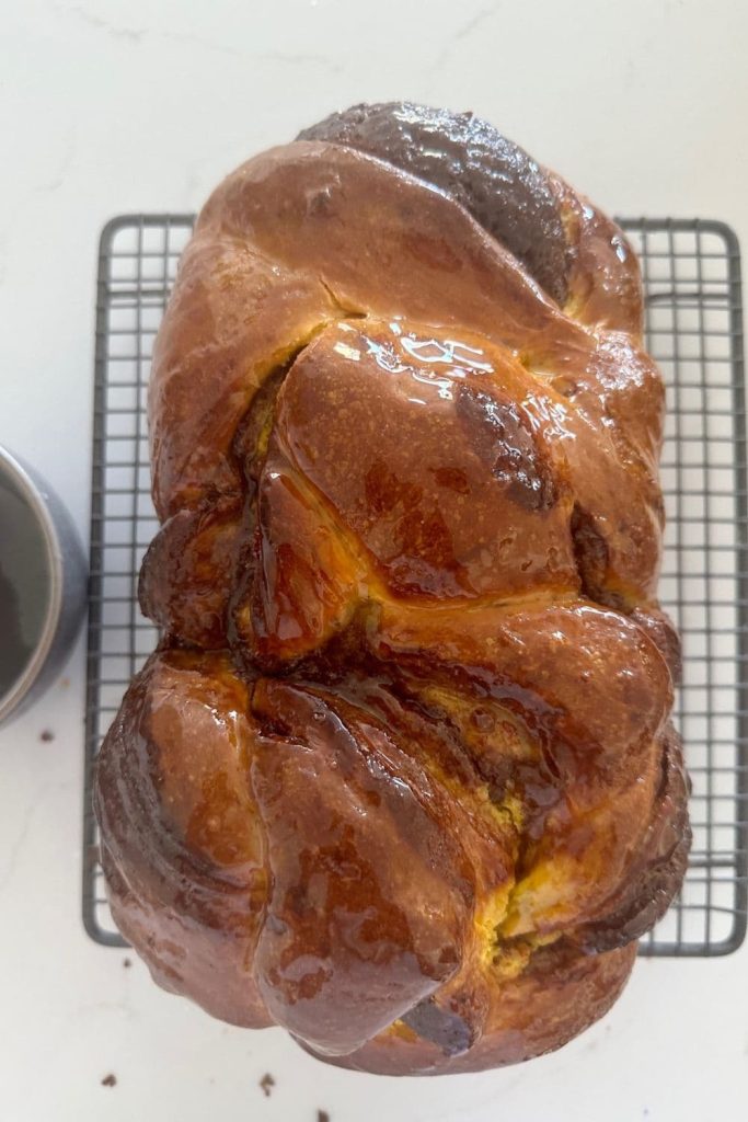 - Carefully remove the sourdough pumpkin babka from the pan and place onto a wire rack. Brush the sugar syrup all over the babka, even on the sides. Use as much of the sugar syrup as you can.