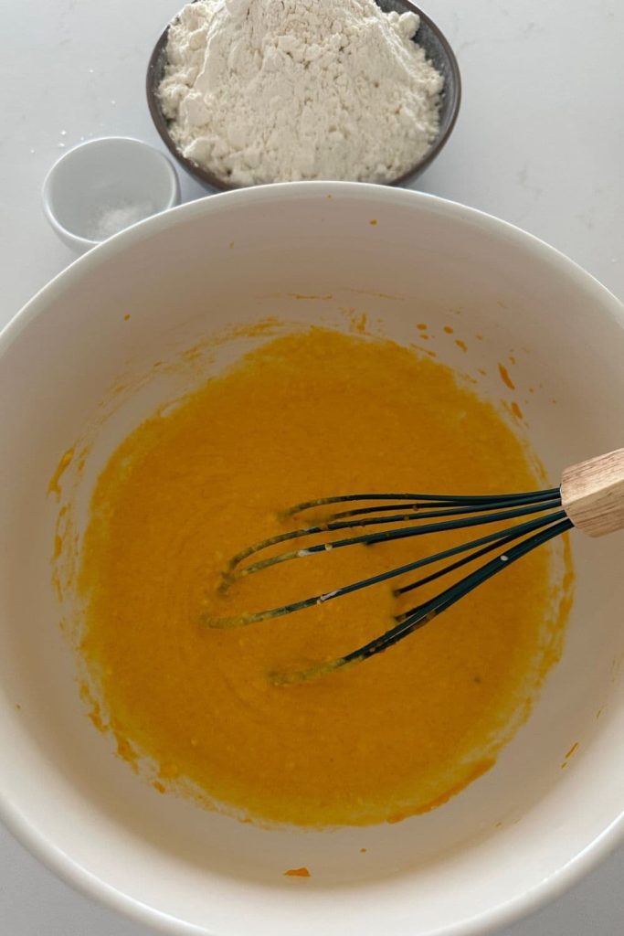 - In a large mixing bowl, beat the eggs and then add the pumpkin puree and sourdough starter. Whisk together to form a smooth batter.