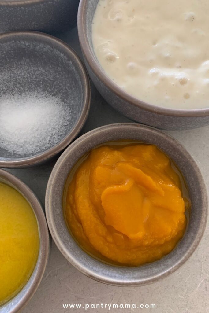 - Premix & Autolyse:Add milk and pumpkin puree into the bowl of your mixer and blend until they are mixed together (it doesn't have to be smooth, just combined).