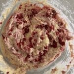 - In a separate bowl, add all of the wet ingredients together (except the frozen raspberries) and stir vigorously to combine, ensuring that the egg is well beaten through the mixture.