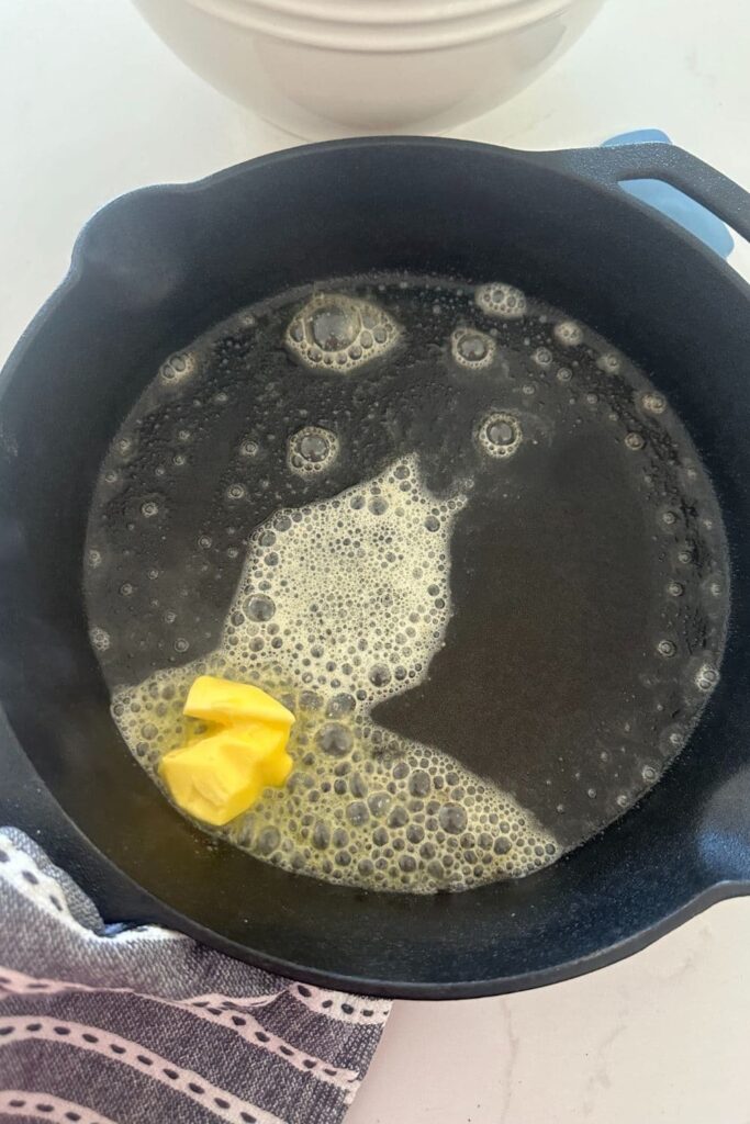 - Carefully remove the preheated skillet from the oven and place the butter inside. Carefully (wearing high heat oven mitts) swoosh the butter around the pan so it melts and coats the cast iron.