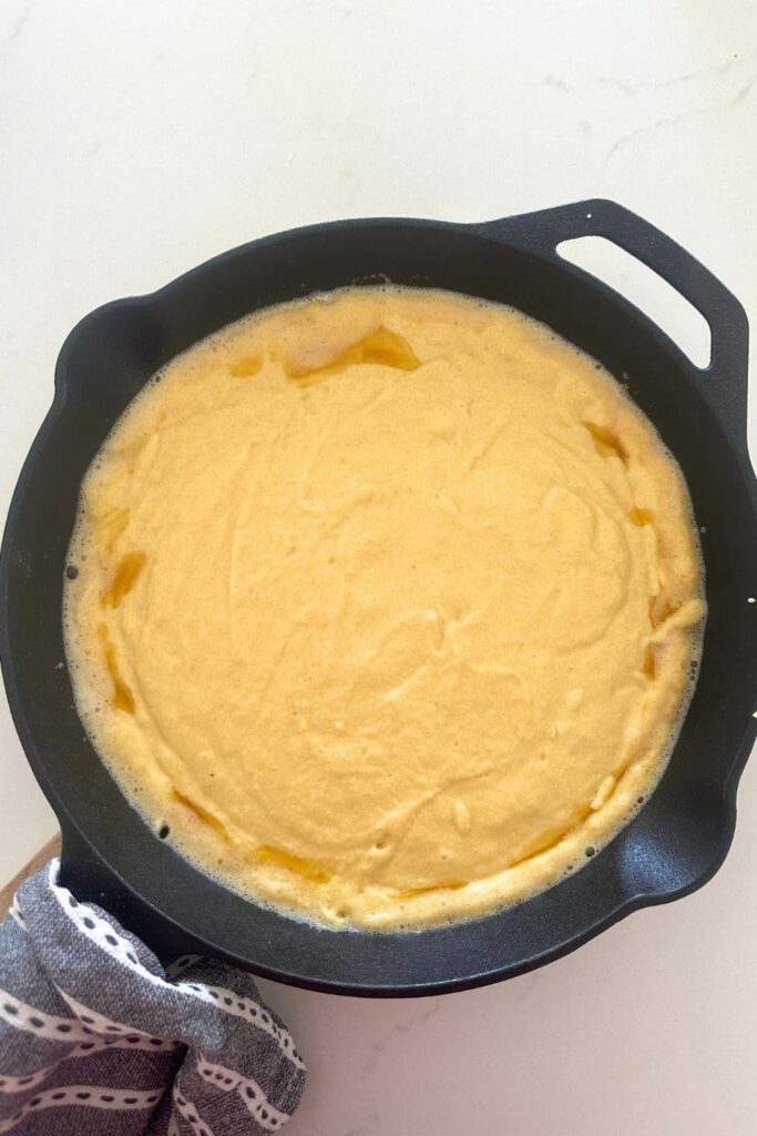 Preheat the skillet - To achieve a golden, crispy crust, preheat your cast iron skillet in the oven before adding the batter. This helps create a nice sear on the bottom of the cornbread as soon as it hits the hot surface. Make sure you add butter to the hot cast iron skillet before pouring the batter in. If you don't want to use butter, you could use any neutral oil you like or even coconut oil.