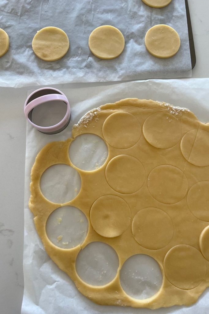 - Take one sheet of dough out at a time and cut the cookies out with a cookie cutter (see notes for how to deal with excess dough). Place the shaped dough onto the cold cookie sheet lined with parchment paper. You want to leave around 5 cm (2 inches) between each cookie.