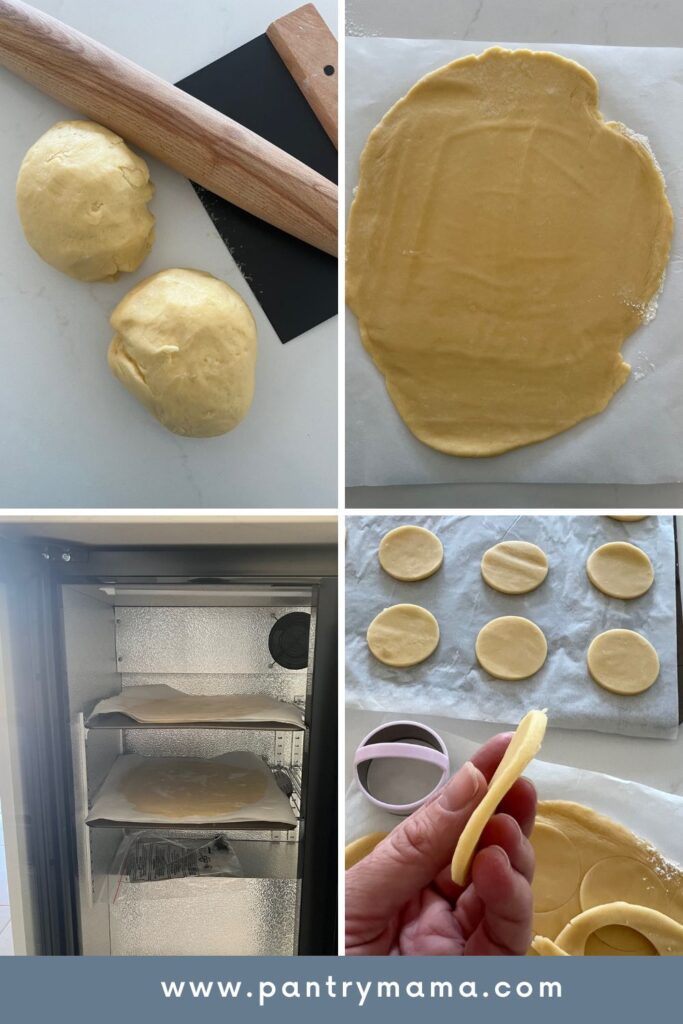 I rolled the dough out between two sheets of parchment paper and placed in the refrigerator for 24 hours. I cut out cookies and gathered the excess dough. I then rolled the excess dough into round balls and with a small glass, dipped in a bit of oil and granulated, white, sugar, I pressed down on the tops and embedded the granulated sugar.