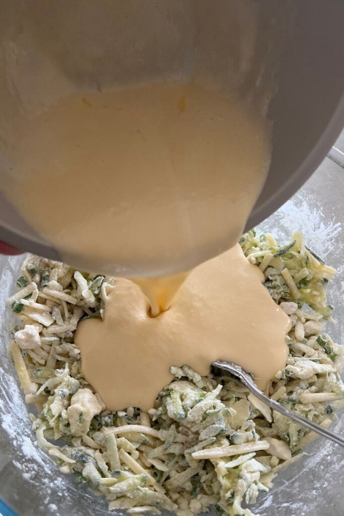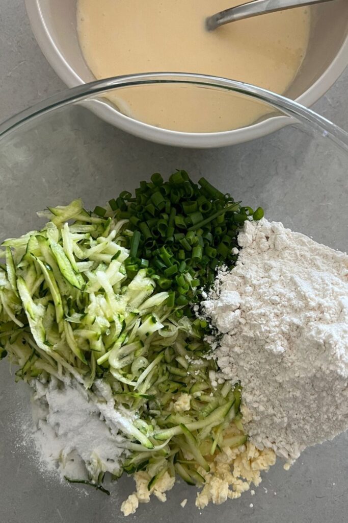 - In a separate bowl mix together shredded zucchini, all purpose flour, salt, baking powder, 3 different cheeses and chives. Make sure that the zucchini is completely coated in flour.