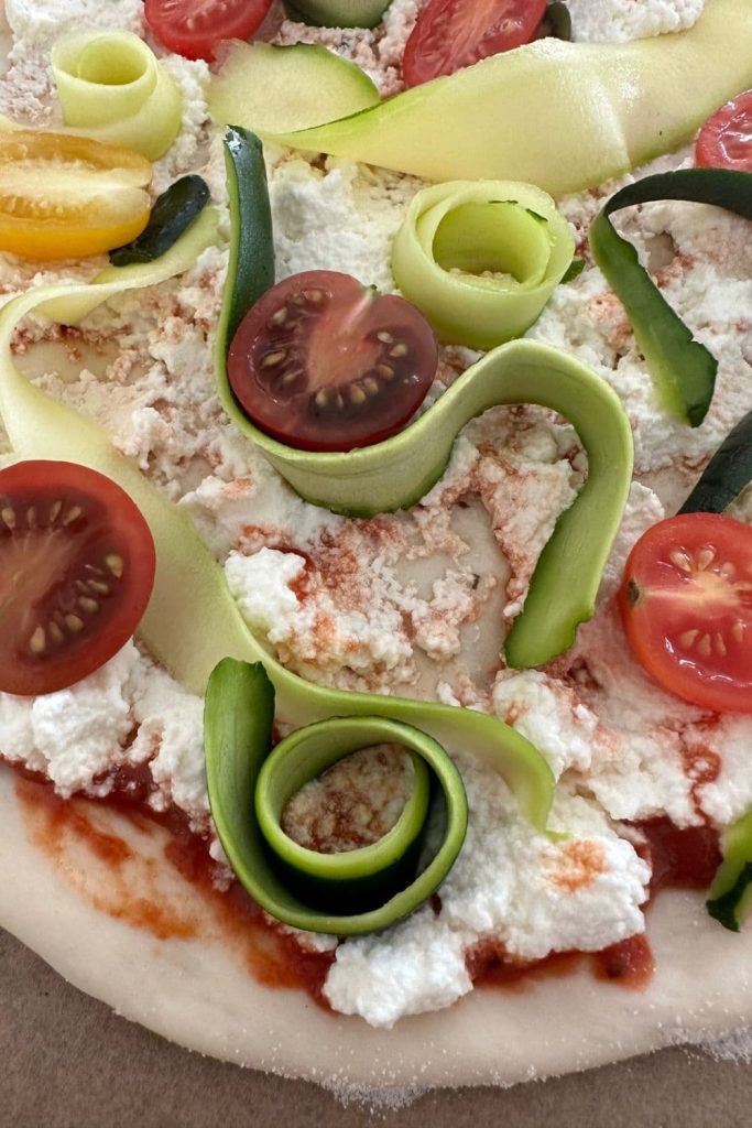 - Use a vegetable peeler to slice the zucchini into ribbons. Add these to the pizza, twisting and rolling them to create some visual interest. Add the cherry tomato halves. Drizzle the whole pizza with olive oil and season with pepper and salt.
