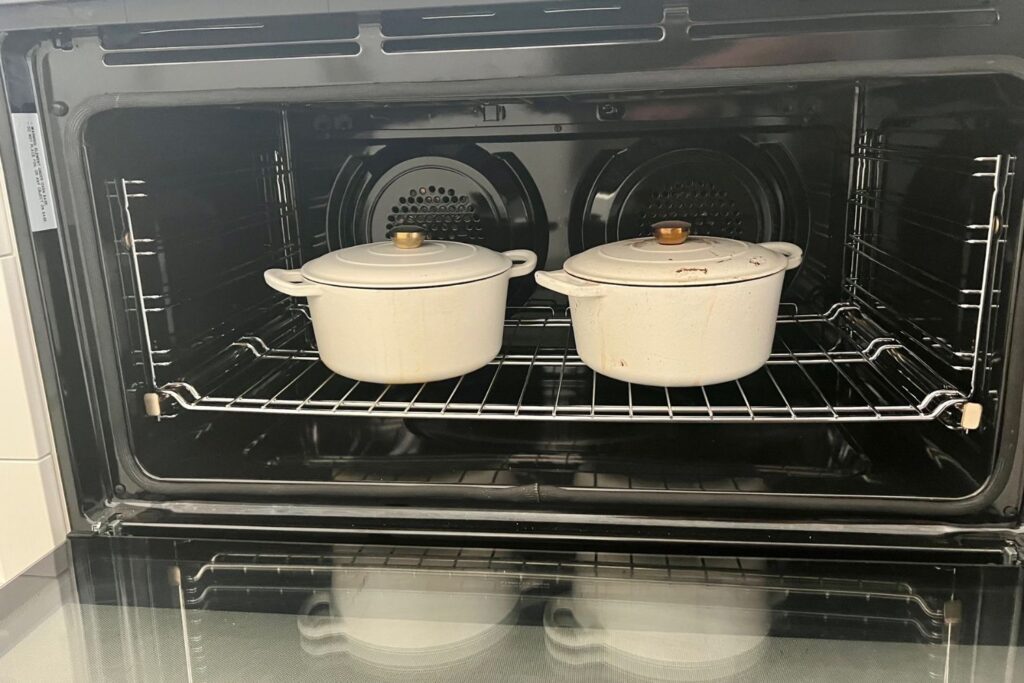 Placing a baking tray on the rack beneath your Dutch Oven insulates the base of the pot and protects it from too much heat, thus preventing the base of your sourdough from burning. It lowers the heat transfer underneath your bread.