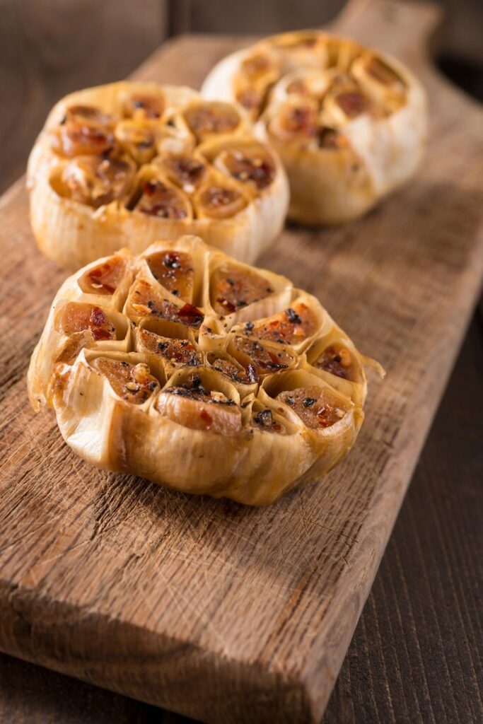 - Slice the top of the head of garlic off with a sharp knife, exposing the cloves. Pour olive oil and salt over the head of garlic and roast in the oven for around 30 minutes at 200C/392F.