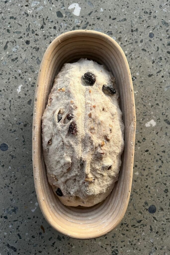 Sprinkle the walnuts and raisins evenly over the dough and then roll it up into a log and place back into the bowl for bulk ferment.