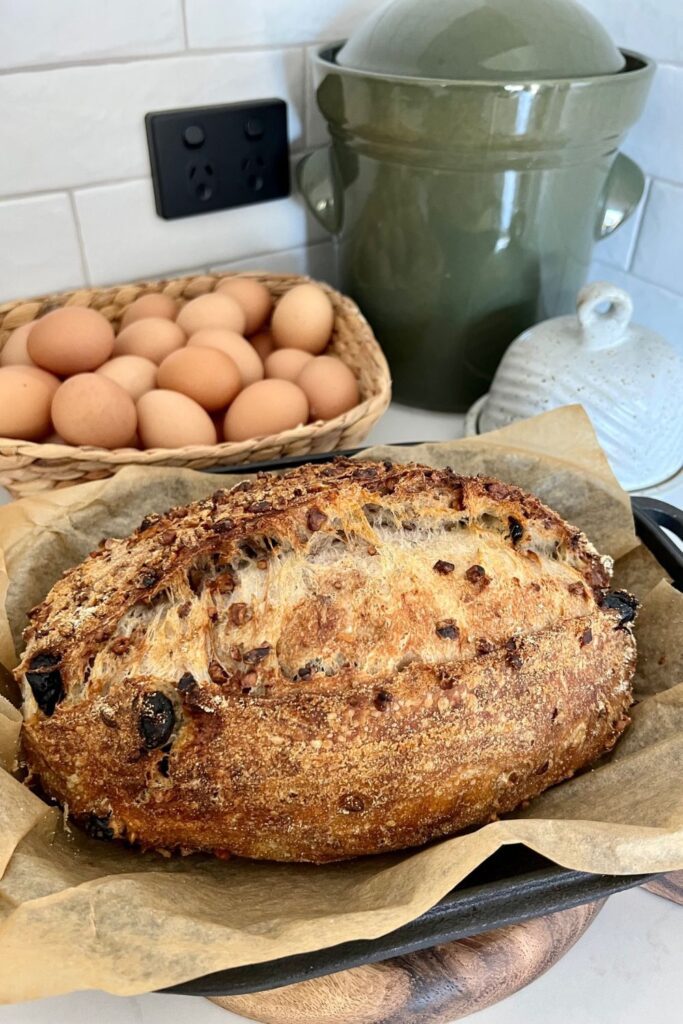 - Bake Time!Now it's time to bake!When your oven is at temperature, take your sourdough out of the fridge. Gently place it onto a piece of baking paper. Make sure that you make the baking paper big enough to use the edges as a handle to lower to dough into your Dutch Oven.Gently score your bread with a lame, clean razor blade or knife. I find a single slash is best for this recipe as the walnuts can be tricky to cut through. You can find my full guide on how to score sourdough bread here.Carefully take your dutch oven out of the oven. Place the sourdough into the pot using the baking paper as a handle. Put the lid on and place into the hot oven. If you want to you can spritz your dough with extra water before you put the lid on.BAKE TIME:30 Minutes with the lid on at 230C/450F plus10-15 Minutes with the lid off at 210C/410F