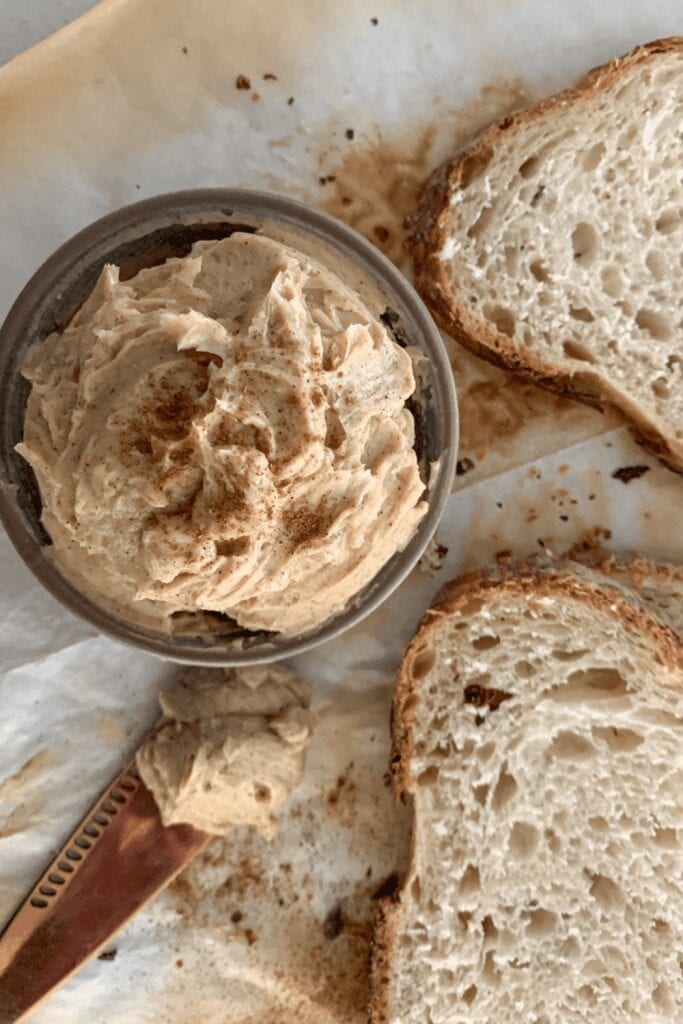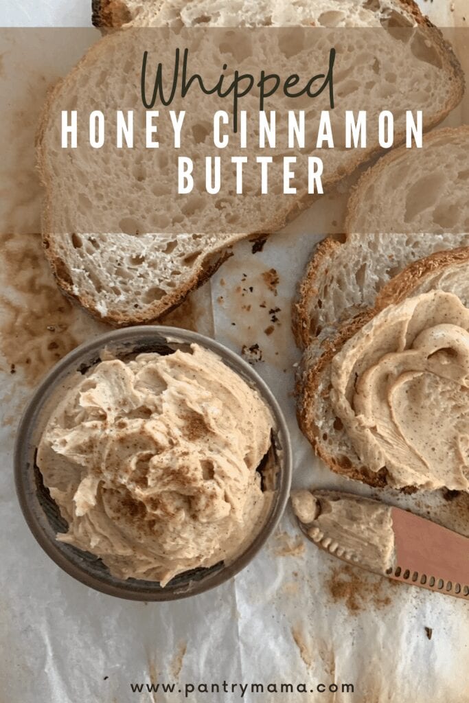 Whipped honey cinnamon butter is a delicious sweet topping for sourdough bread.