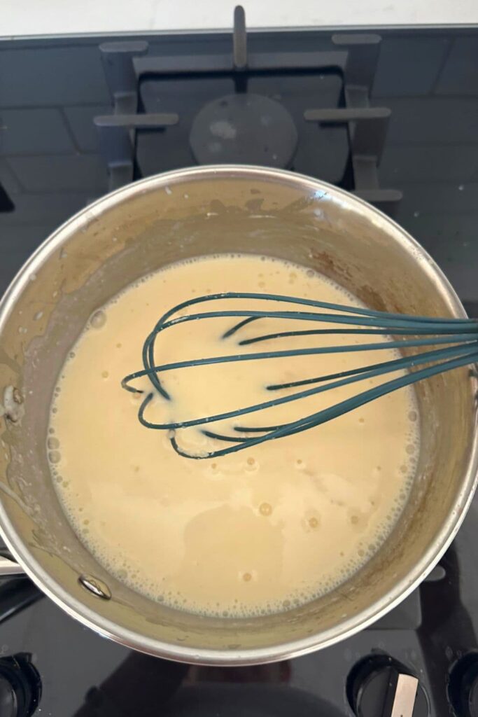 Now, add the milk in small batches while continuing to whisk the white pizza sauce. You can do this over a low heat.