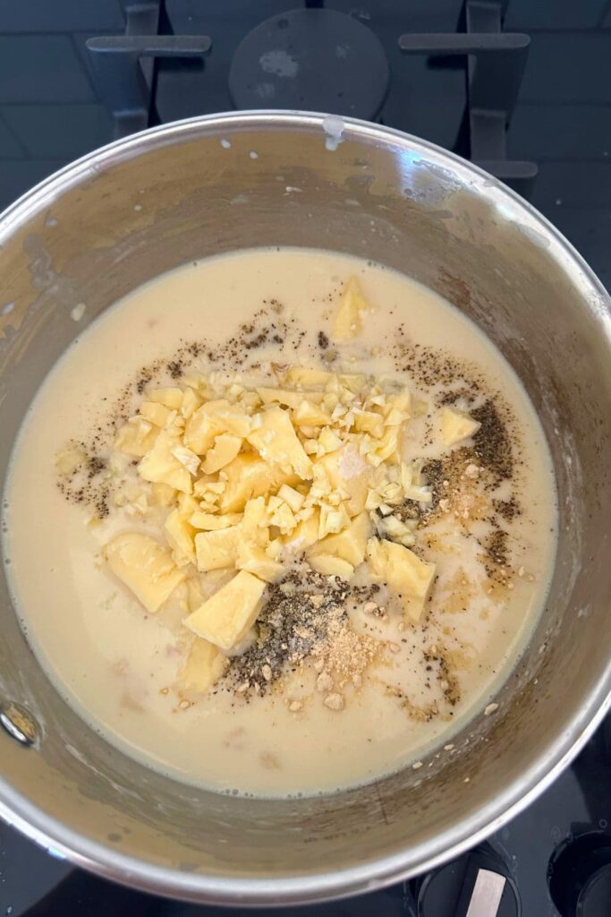 - Once all the milk has been added and the sauce is starting to thicken, add the minced garlic, crumbled sharp cheddar, salt, pepper and onion powder.